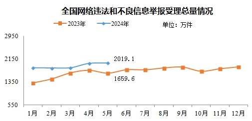 - 2024年5月全国受理网络违法和不良信息举报2019.1万件