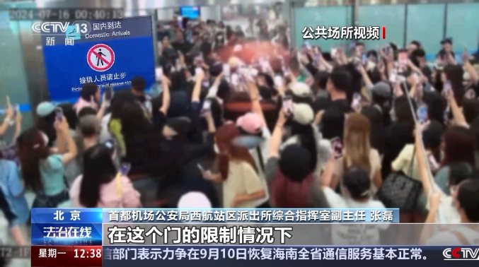 首都机场公安局西航站区派出所综合指挥室副主任 张磊:大量粉丝往前走,在狂热的情绪引领下,他们很难控制住自己。有几个粉丝摔倒了,后边的人也根本看不到,直接跨过去。要不是安保人员及时把她拉起来,很有可能就酿成极其重大的公共安全事故。