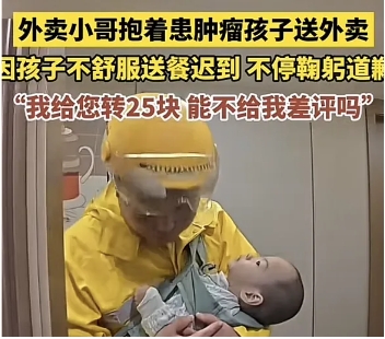 相关视频显示,一个身着骑手服饰的男子抱着孩子,向视频拍摄者连连道歉称:“不好意思,刚才孩子有点不舒服,孩子的气管切开了,有点呼吸不上来。”并表示:“我给你转25块钱,能别给我差评吗?”
