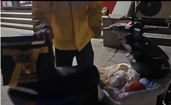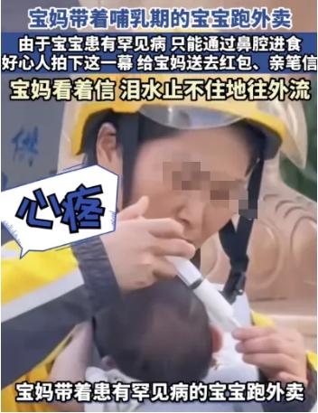 相关视频显示,一名身着外卖服饰的女子坐在电动车上,胸前绑着一名婴儿。视频发布者称,“由于宝宝患有罕见病,只能通过鼻腔进食。”