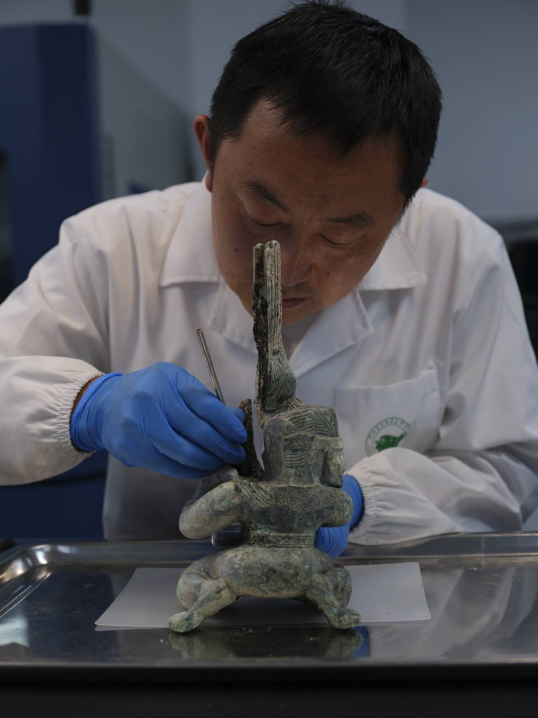 (文物保护工作者正在清理青铜扭头跪坐人像)