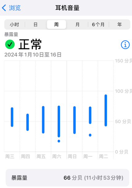 另外,很多手机里也可以统计耳机的音量情况。比如,苹果手机的健康模块中,就有这样的功能,你可以看看日常听音乐时候耳机音量是多少,有没有超过每周的“安全听力时间”。