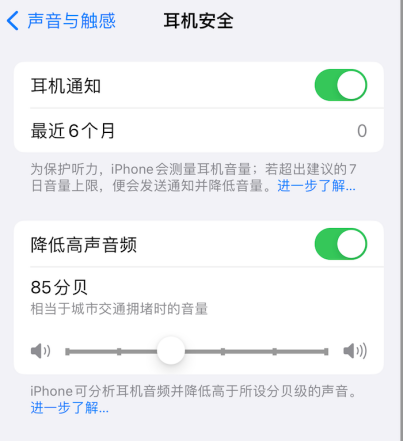 其实,在很多手机里都会自带听力保护的功能。当音量调节过大的时候,会自动弹出提示。同时也可以直接调整安全上限,在耳机音量超过上限的时候自动降低音量。