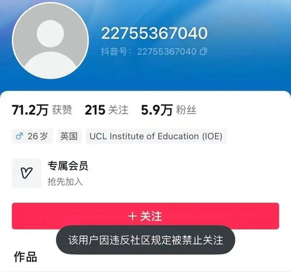 梁某的短视频账号已被禁止关注。图片来源:梁某短视频账号截图