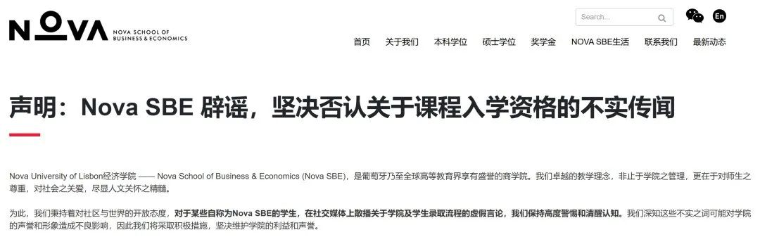今年4月,葡萄牙新里斯本大学商业经济学院(Nova School of Business & Economics,下简称Nova SBE)在官网中文页面上发表声明称,“对于某些自称为Nova SBE的学生,在社交媒体上散播关于学院及学生录取流程的虚假言论,我们保持高度警惕和清醒认知。我们深知这些不实之词可能对学院的声誉和形象造成不良影响,因此我们将采取积极措施,坚决维护学院的利益和声誉。”