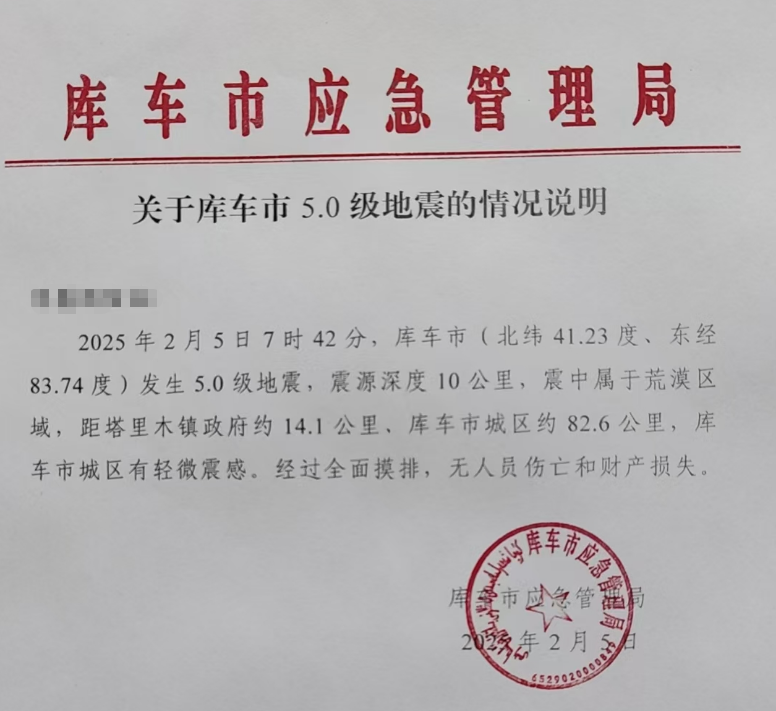 据中国地震台网消息:02月05日07时42分在新疆阿克苏地区库车市(北纬41.23度,东经83.74度)发生5.0级地震,震源深度10千米,震中属于荒漠区域,距塔里木镇政府约14.1公里、库车市城区约82.6公里,库车市城区有轻微震感。