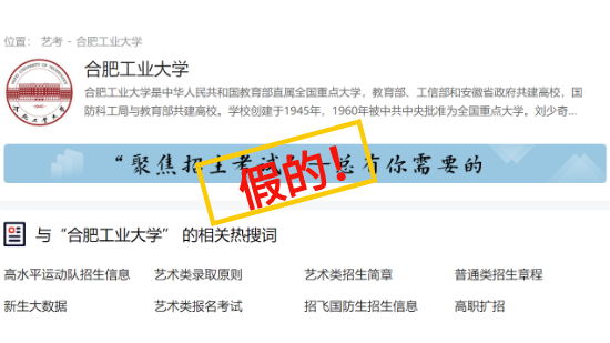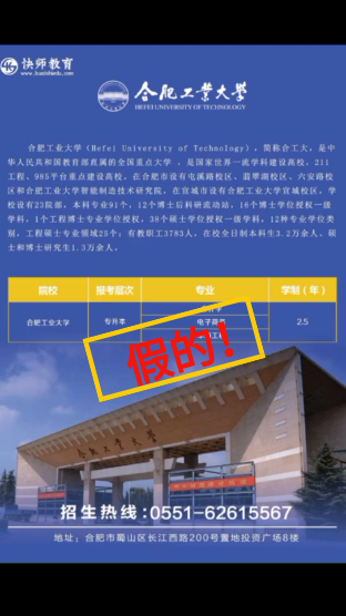 没错,这些打着所谓“**教育机构”,冒用“合肥工业大学”名义,未经许可、非法盗用、肆意篡改学校形象标识,发布“三年拿证”“四六级免考”,“两年毕业、无需到校”等虚假信息和招生广告的网页和网站,全是假的!