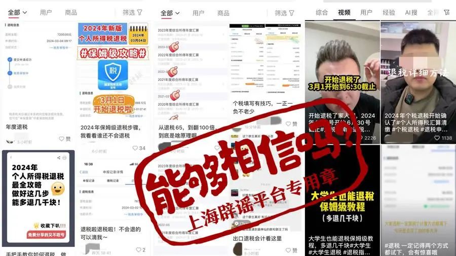 在社交平台上,有不少“专业退税”“帮你退税”的帖子。上海辟谣平台核查发现,这类内容良莠不齐。其中,有一部分帖子确实介绍了“个税申报”的正确做法,包括如何填写专项扣除、如何申报年终奖等一次性收入等。但是,要提防那些误导他人虚假填报或打着“帮你退税”等旗号设置的诈骗陷阱。