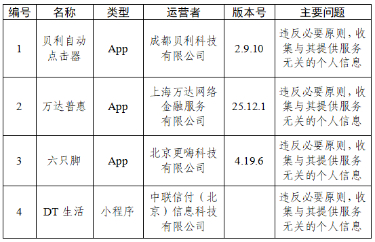三、贝利自动点击器、万达普惠等4款App违反必要原则,收集与其提供的服务无关的个人信息(详见下表)。